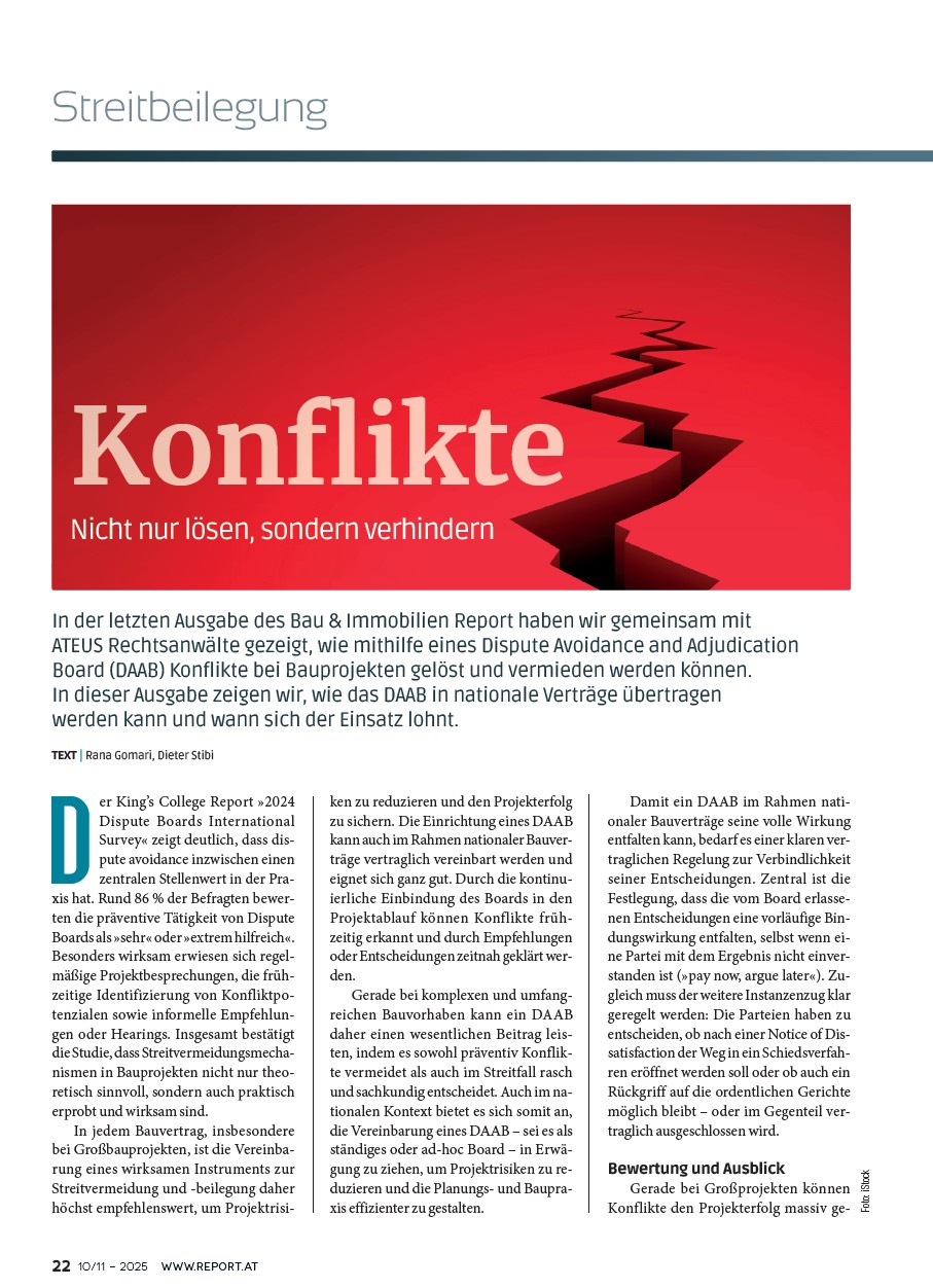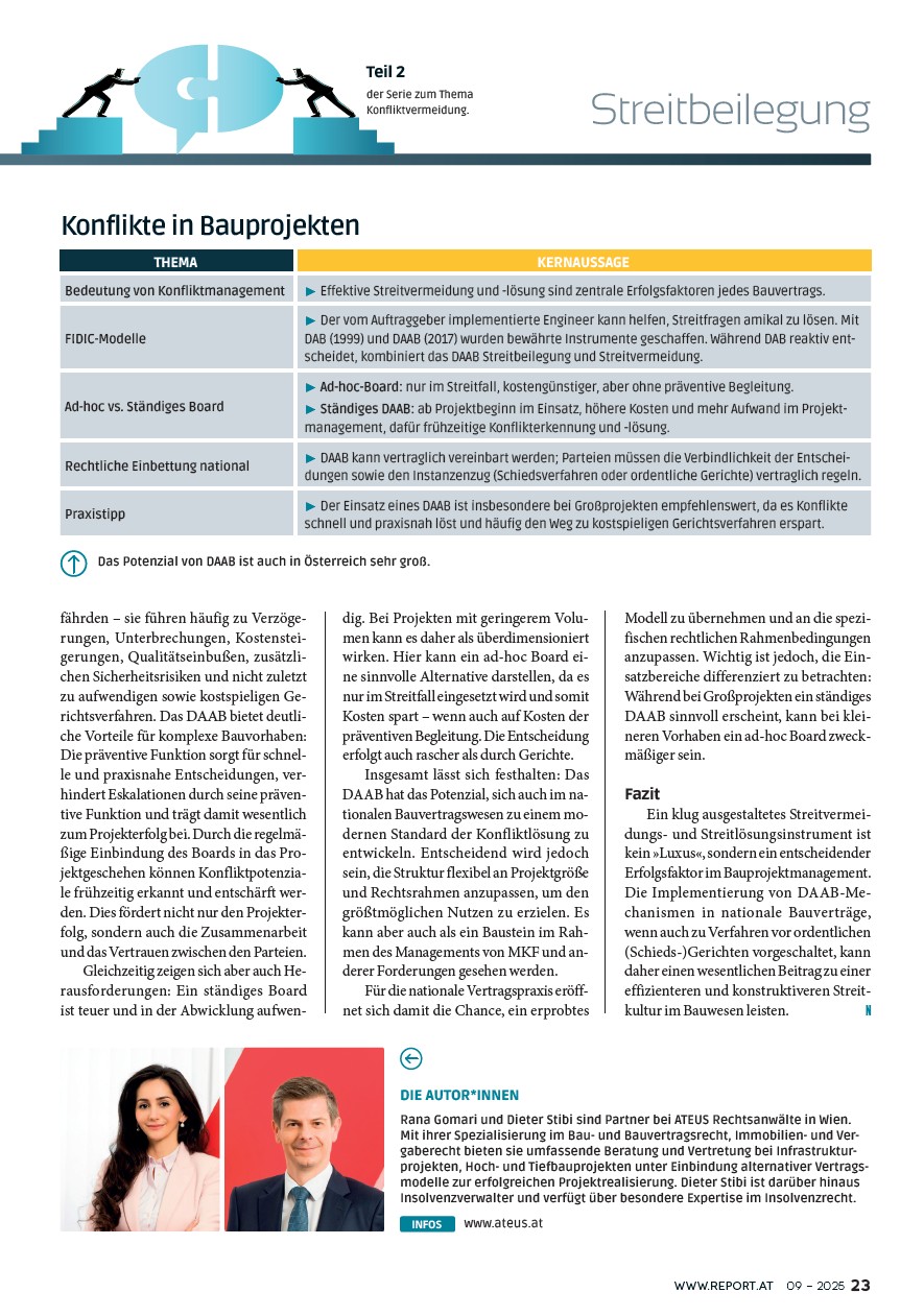 Rana Gomari und Dieter Stibi zeigen im Bau & Immobilien Report im zweiten Teil der Serie, wie das DAAB auch in nationale Bauverträge integriert werden kann – und warum es sich lohnt, Streitvermeidung vertraglich mitzudenken. 💭